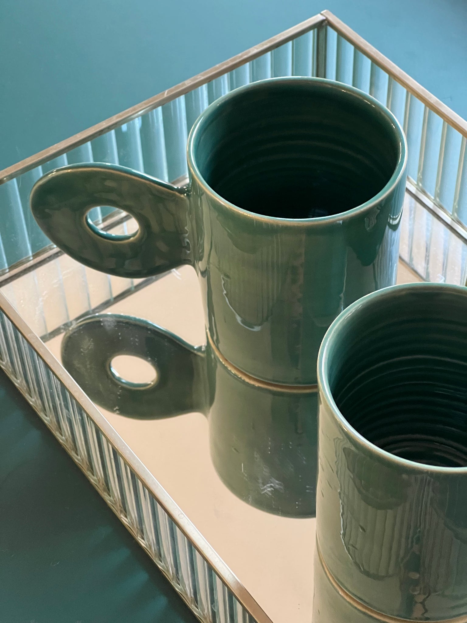 Handmade stoneware mug with rounded handle glazed in greenish blue.