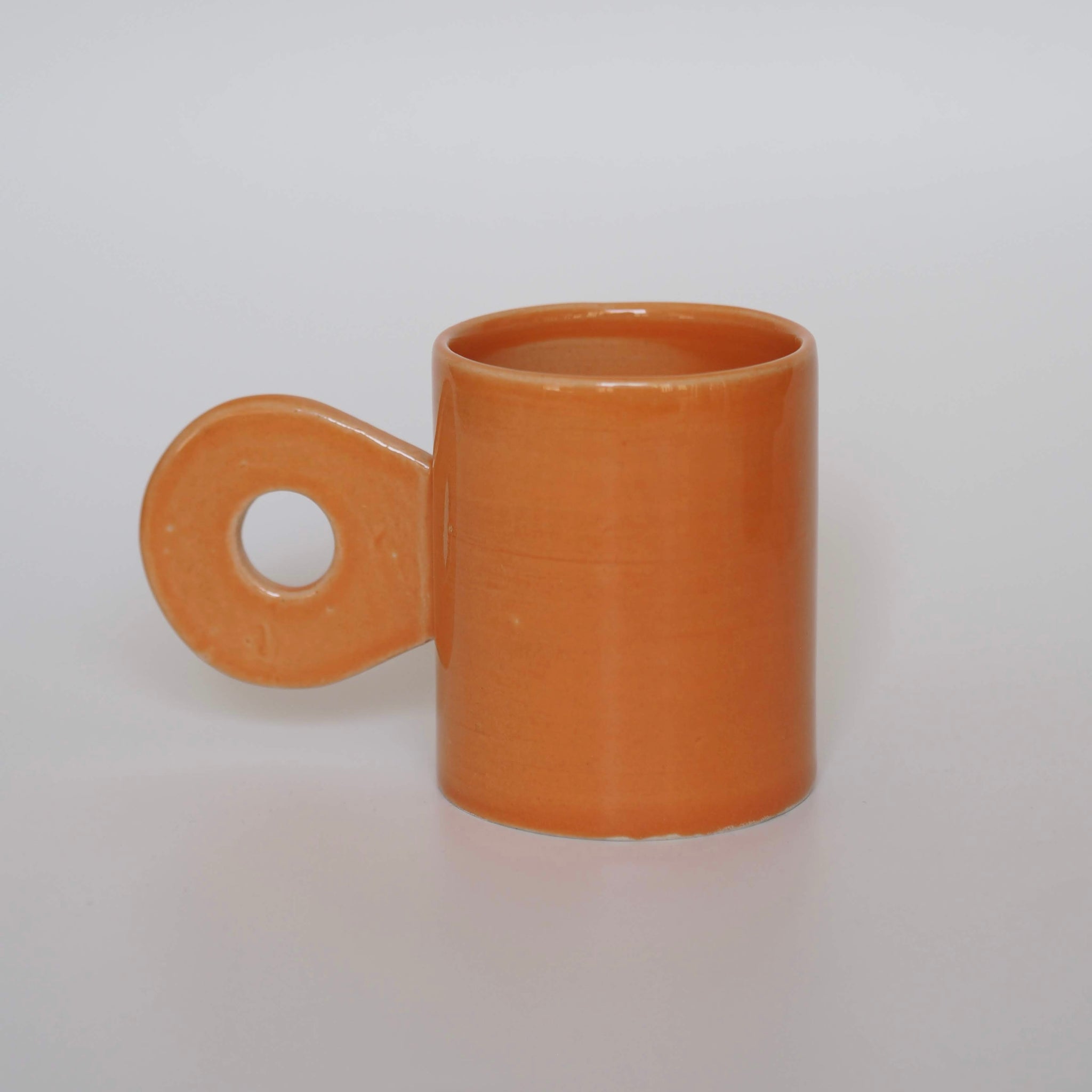 Handmade stoneware mug with rounded handle glazed in orange color.