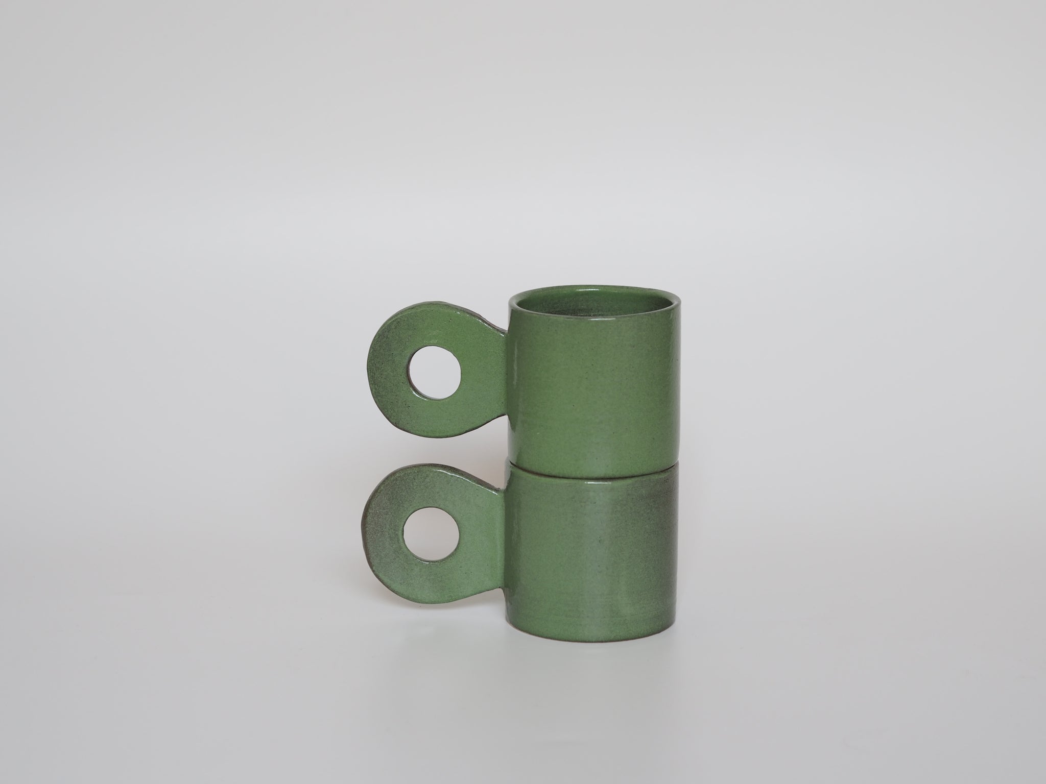 Handmade stoneware mug with rounded handle glazed in green color.